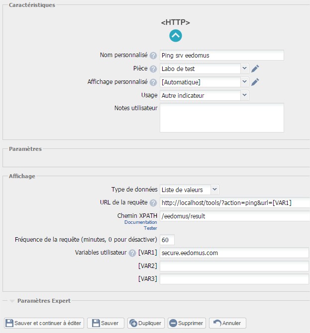 Nous allons ensuite interroger une autre ip toujours joignable sur internet, le DNS de google, soit l’adresse IP 8.8.8.8 sur une fréquence de 60 minutes. Ce test permettra de confirmer l’absence d’internet et aussi de détecter une panne des serveurs eedomus.
