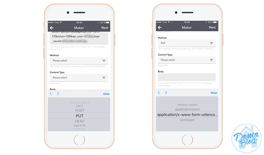 5 Sortez vos API eedomus, ils vont êtres nécessaires pour cette étape. Il s’agit de saisir l’URL de l’API eedomus dans le champ URL, je vous détaille l’URL plus bas. Choisir la méthode PUT puis en content type, “application/x-www-form…”