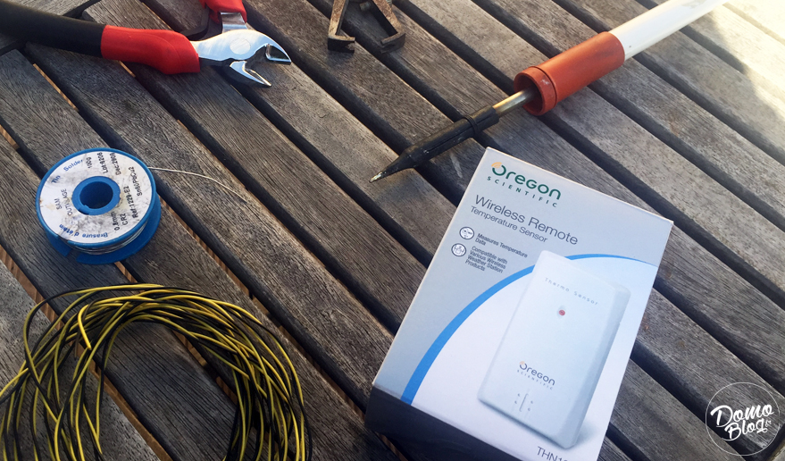Une petite touche de DIY aussi dans ce tuto, puisque nous allons devoir déporter la sonde de température de du module Oregon. Pour cela nous aurons besoin d’un peu de matériel mais rien d’introuvable puisqu’il s’agit simplement de fil électrique, d’un peu de gaine thermo et quelques outils (pinces, fer a souder et étain).