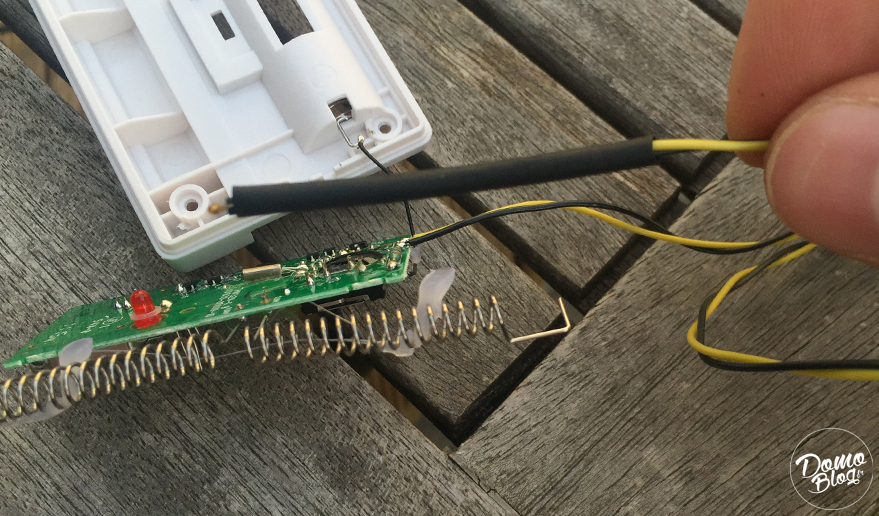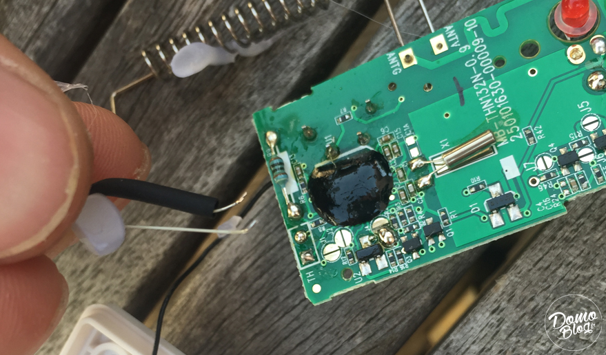 4 Soudez ensuite deux fils en lieu et place de la sonde sur la carte. J’ai pour ma part utilisé des fils utilisé en téléphonie, ils sont petit, il n’est pas utile de passer avec une grosse section de fil au contraire, une petite section est vivement recommandée.
