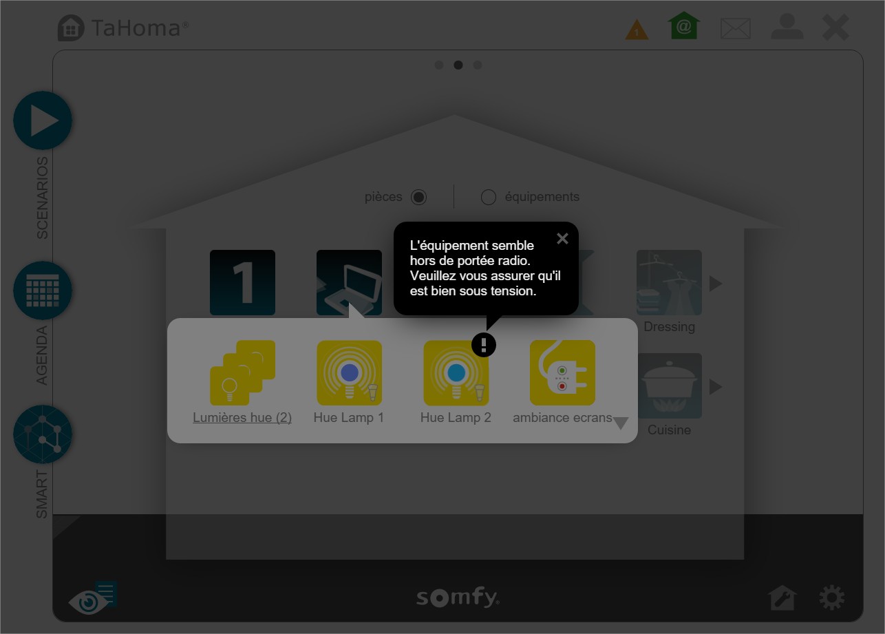 Enfin, si votre lampe n’est pas disponible car pas connectée ou encore pas alimentée, vous recevrez une notification sous l’interface Somfy. Dans ce cas vérifiez que la lampe soit bien alimentée électriquement sans quoi, il ne sera pas possible de lui envoyer d’ordre, que ce soit de l’application Somfy mais aussi de l’application Philips.