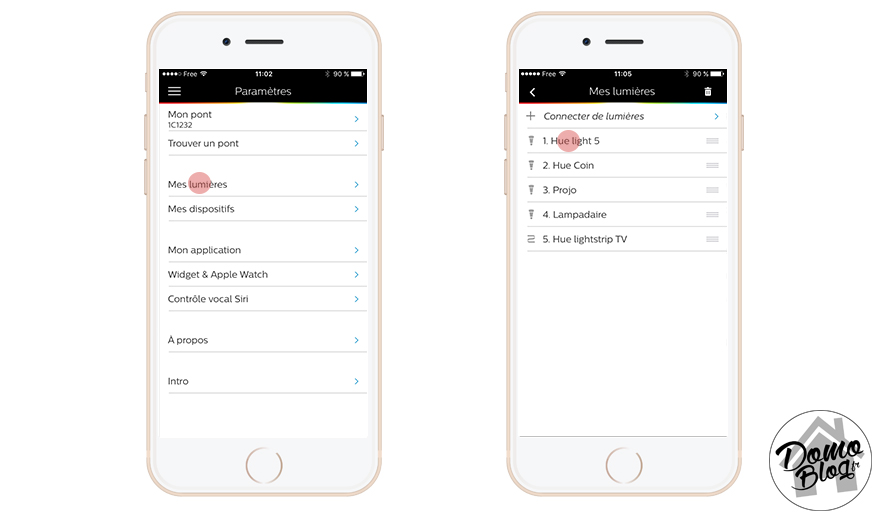 3 Il faut ensuite aller dans Mes lumières (écran de gauche), la nouvelle ampoule apparaît dans la liste (écran de droite) sélectionnez la nouvelle ampoule pour lui donner un nom