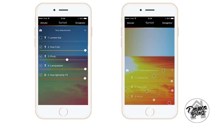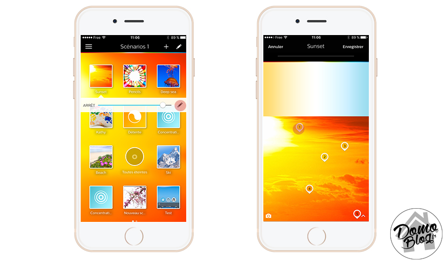 6 Enfin (écran de droite) déplacez le numéro correspondant à la nouvelle ampoule pour définir sa couleur.