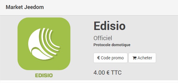 Maintenant que vous possédez le dongle et les périphériques, il ne reste plus qu’à procéder à l’installation et la configuration du plug-in sous Jeedom. Pour cela rien de compliquer, rendez-vous sur le market Jeedom et lancez une recherche sur le terme Edisio. Le plug-in coûte la somme de 4€.