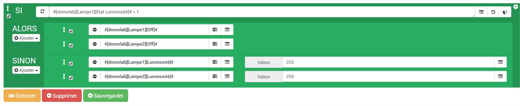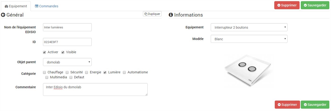 1 Passez en mode inclusion et appuyez sur un bouton du périphérique à inclure. Ici par exemple, j’intègre un interrupteur deux boutons, j’appuie sur un des boutons. 2 Votre nouveau périphérique est détecté et sa fenêtre de configuration s’ouvre. Remplissez simplement les informations demandées, un nom, une pièce d’affectation, une catégorie et enfin le type d’équipement, ici , interrupteur 2 boutons, puis sauvegardez. 3 Voila, votre premier périphérique est prêt à l’utilisation dans votre box Jeedom, vous le retrouvez dans la section Mes Équipements Edisio 4 Et bien sûr, sous la pièce que vous lui avez affectée. Bien qu’il dispose de deux boutons, l’interrupteur peut gérer 4 actions, appuis courts ou bref et les appuis longs, vous disposez donc de 4 actions sur le visuel du périphérique. 5 Du côté des règles, c’est classique, sachez toutefois que vous pouvez également multiplier par deux les actions possibles en utilisant le même bouton pour allumer ou éteindre un périphérique.Exemple avec ce scénario qui contrôle l’allumage et l’extinction de deux ampoules Philips Hue avec le même bouton: