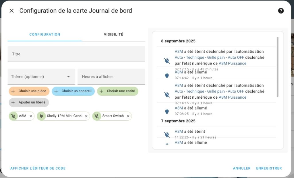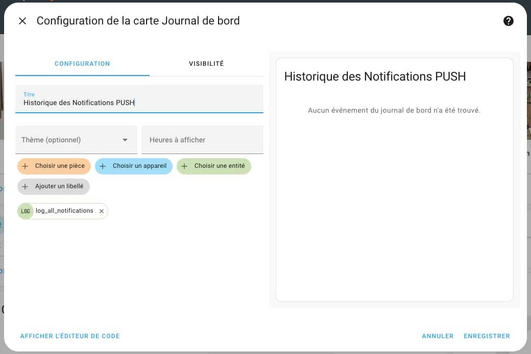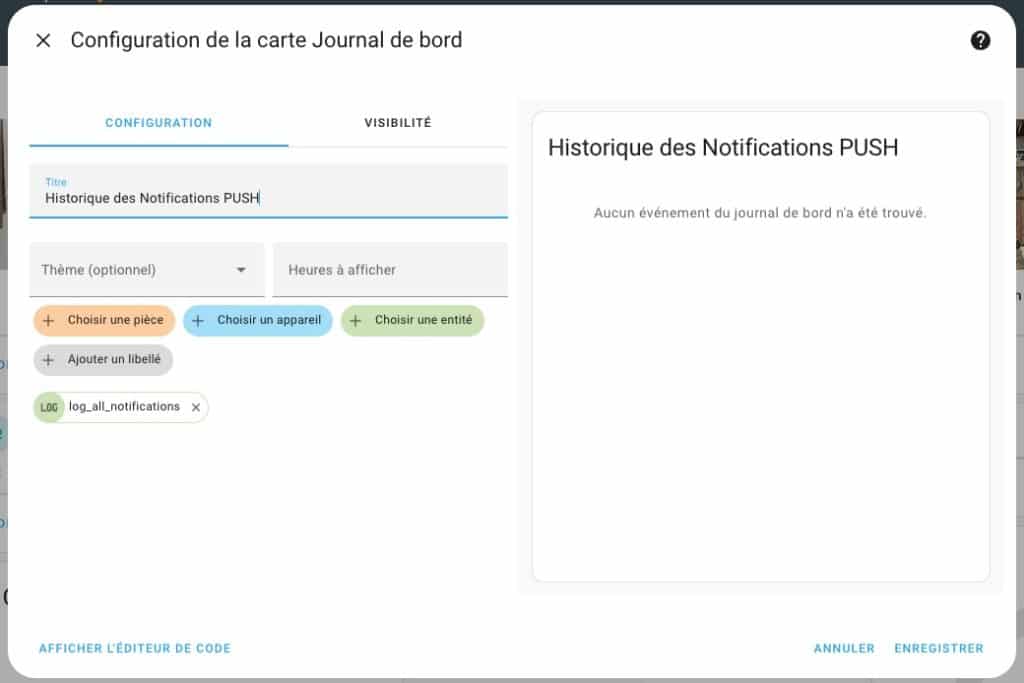 Il s’agit maintenant de créer une tuile sous le tableau de bord qui va lister les différentes notifications de sorte à en avoir un historique. Notre automatisation va stocker les notifications dans le helper texte et nous allons simplement afficher cette entité dans une tuile journal de bord qui convient parfaitement pour ce type d’utilisation.