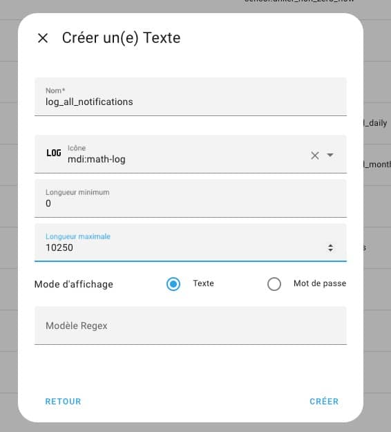 Pour cela, il faut se rendre sous Paramètres / Appareils et services / Entrées. Sélectionnez alors la création d’une nouvelle entrée Texte dans la liste et procédez à sa configuration comme ci-dessous.
