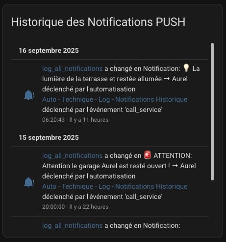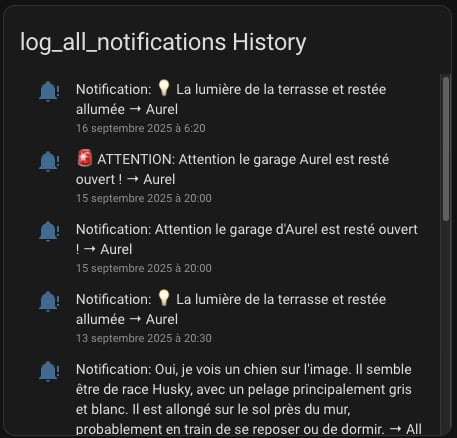 Personnellement, j’utilise plusieurs canaux pour me notifier. Selon le type d’alertes ou d’informations, je priorise l’un ou l’autre. Dans le cas des mails ou de Telegram, les messages sont historisés automatiquement soit dans la boîte mail soit dans Telegram où l’on peut ensuite générer la purge selon ses besoins. Mais dans le cas d’une notification push via l’application Home Assistant Companion, une fois que l’on a lu ou du moins vu la notification, il n’est plus possible d’y revenir.