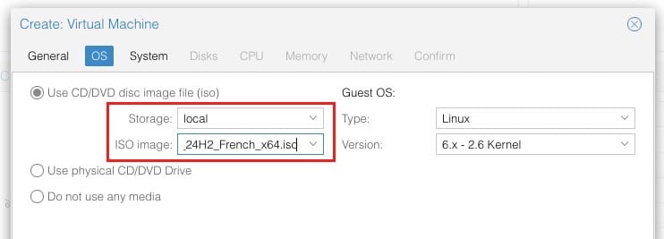 3. Ensuite, il faut configurer la partie OS en pointant vers le media d’installation, l’image ISO que vous avez téléchargé au préalable.
