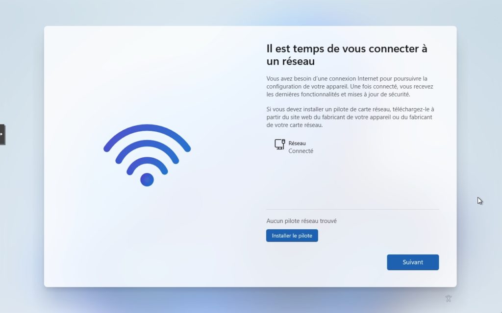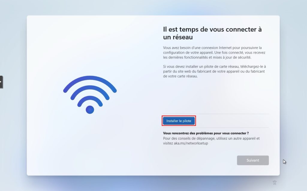 18. Un nouveau probleme surgi, il s’agit de l’absence de réseau sur la VM pour continuer, car Windows 11 nécessite une connectivité. Pas d’inquiétude là non plus, c’était prévu. Cliquez simplement sur Installer le pilote.