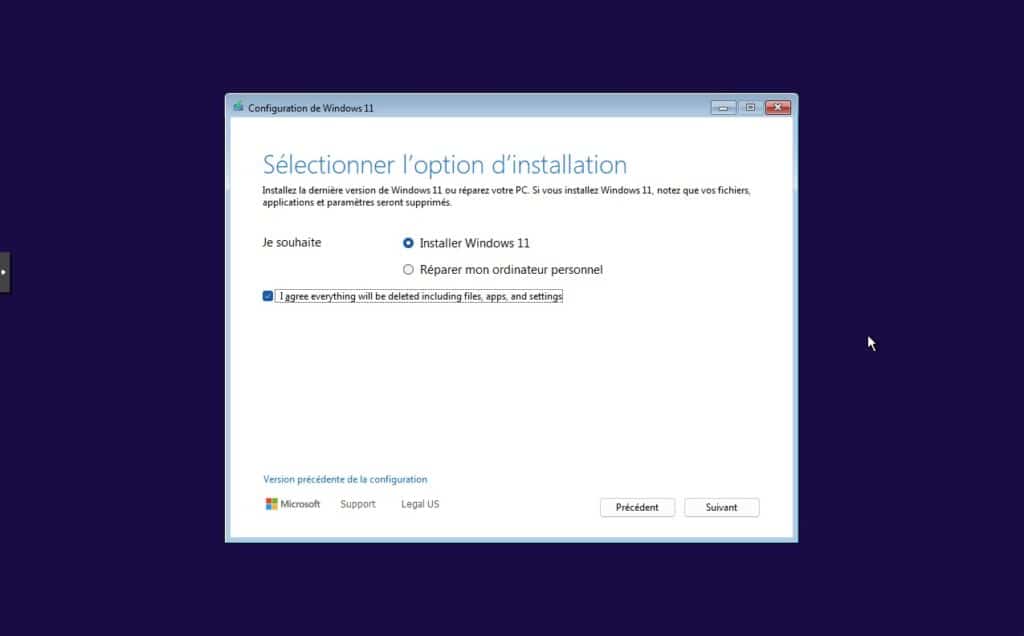 3. On suit les étapes les unes après les autres, identiques à une installation classique de Windows sur un PC.