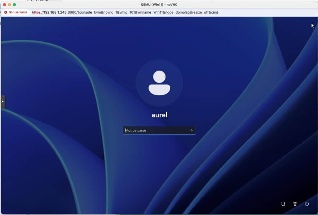 Notre Machine Virtuelle Windows 11 sous Proxmox est maintenant prête, il ne nous reste plus qu’a nous y connecté avec un compte connu.
