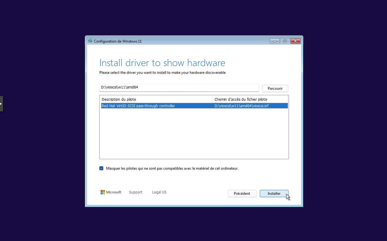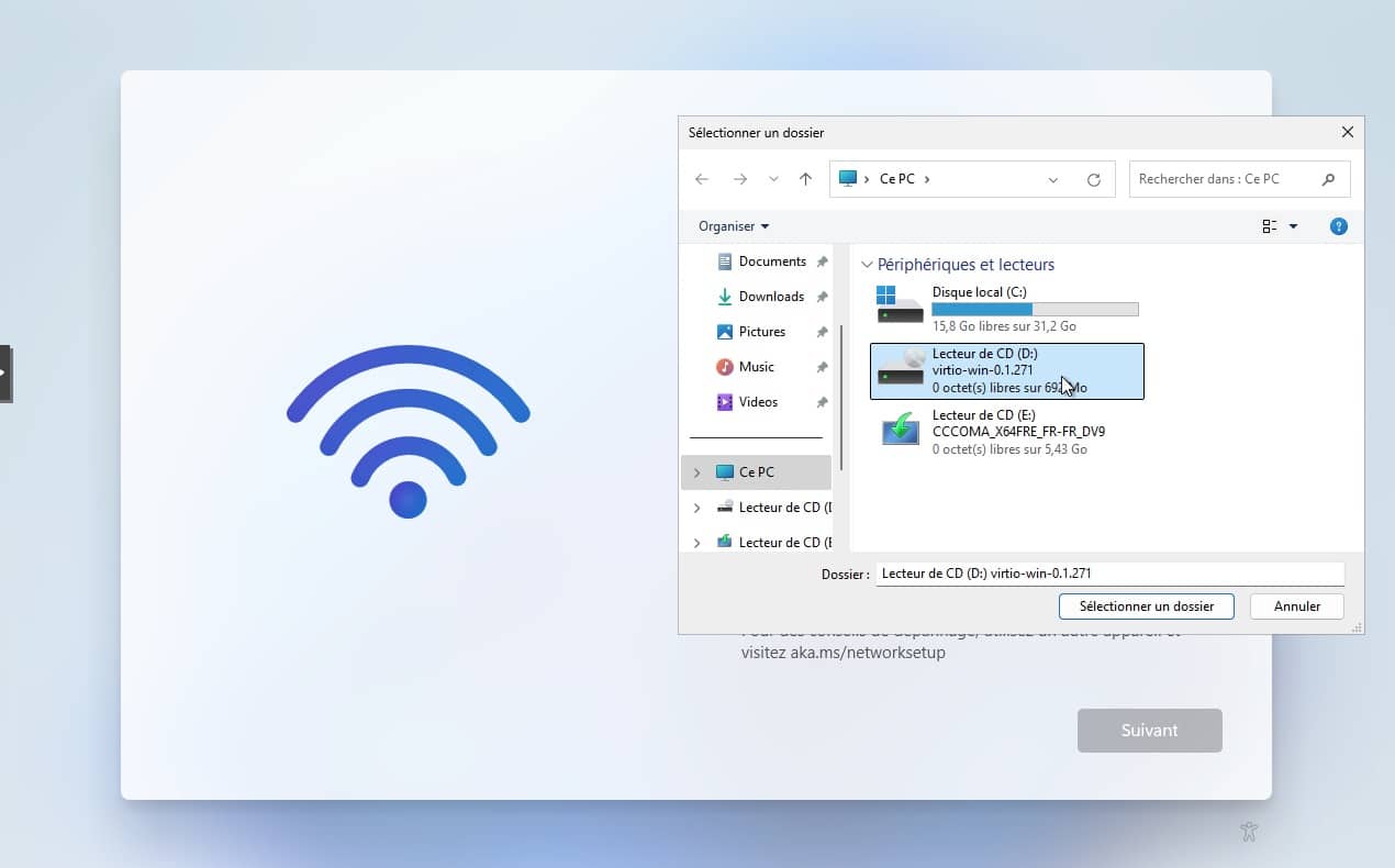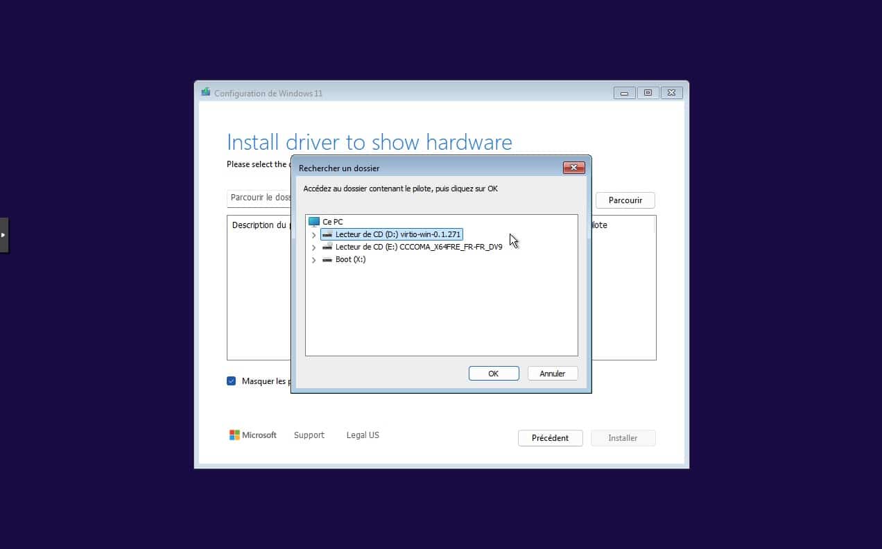 8. Naviguer vers l’emplacement des VirtIO drivers, c’est à dire le lecteur monté au demarrage.