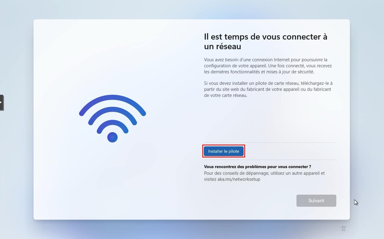 18. Un nouveau probleme surgi, il s’agit de l’absence de réseau sur la VM pour continuer, car Windows 11 nécessite une connectivité. Pas d’inquiétude là non plus, c’était prévu. Cliquez simplement sur Installer le pilote.