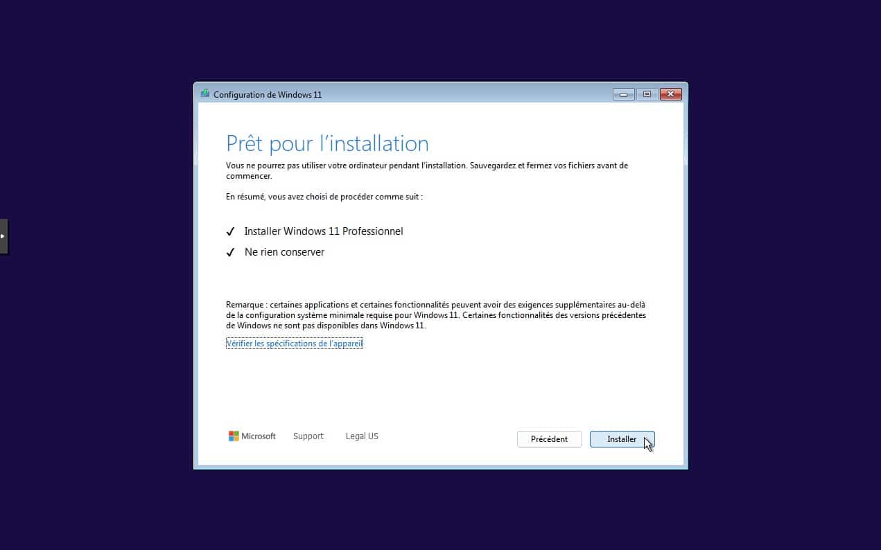 3. On suit les étapes les unes après les autres, identiques à une installation classique de Windows sur un PC.