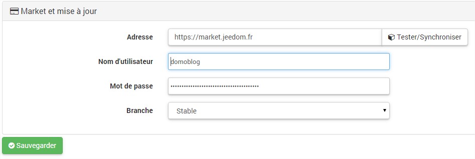 1 Pour cela, rendez vous simplement dans la configuration de Jeedom2 Ensuite rendez vous dans l’onglet Market et mise à jour. 3 Saisir vos identifiants puis testez via le bouton “Tester/Synchroniser”