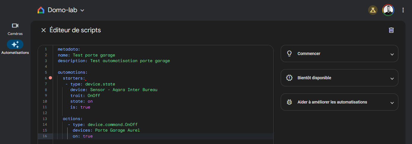 Comme on peut le voir dans l’éditeur de script du Google Home du domo-lab ci-dessus, si vous êtes familier avec l’édition d’automatisation sous la domotique Home Assistant en mode script, vous ne serez pas dépaysé, bien au contraire.