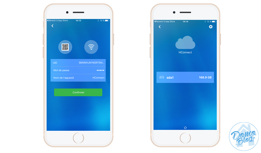 1 Une fois installé, connectez le mini H.Connect via son UID puis saisissez le mot de passe de connexion. L’appli se connecte ou boîtier et le volume du périphérique connecté apparaît à l’écran, ici mon disque externe de 160Go.