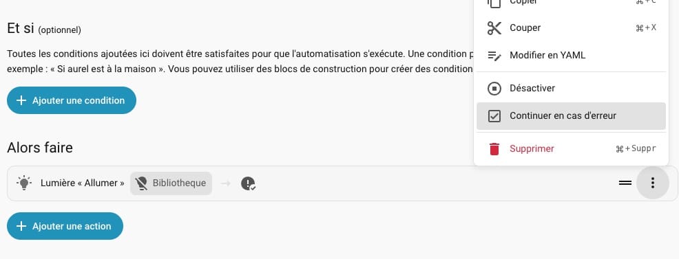Désormais, l’éditeur d’automatisation permet de continuer l’exécution même si une erreur est détectée. Ceci est particulièrement pratique pour les automatisations où l’échec d’une seule action ne doit pas empêcher le reste de s’exécuter. Par exemple, si l’une des notifications échoue, les autres seront tout de même envoyées.