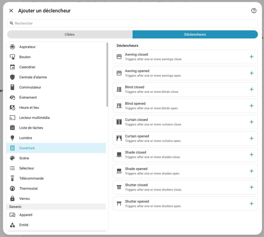 Jusqu’à présent, vous deviez connaître la nature exacte de votre capteur (capteur binaire, dispositif de verrouillage, entité numérique) pour déclencher une action. Mais ce n’est pas ainsi que nous concevons nos maisons ! Nous pensons en termes de “portes”, de “fenêtres” ou de “mouvements”.