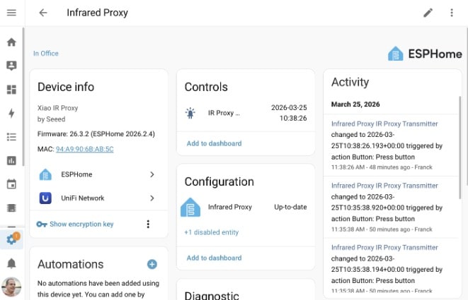 La bonne nouvelle, c’est qu’il est possible de rendre tous ces appareils intelligents en exploitant le canal infrarouge. C’est là que la magie de la domotique opère : pour quelques euros seulement, un simple micro-contrôleur ESP (via ESPHome par exemple) couplé à un émetteur IR permet de les intégrer nativement dans Home Assistant. Vous pouvez ainsi domotiser à moindre coût vos anciens appareils et les inclure dans vos routines modernes ! Nous aurons l’occasion d’y revenir en détail.