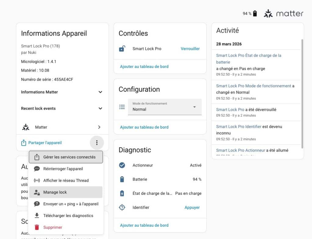 Directement sur la page de votre serrure Matter, un nouveau bouton “Gérer la serrure” fait son apparition. Ce véritable tableau de bord de sécurité vous permet de :