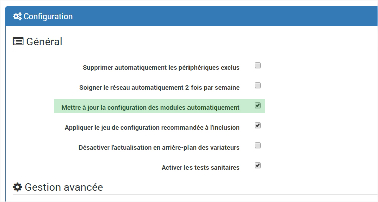 1 Pour cela, rendez vous dans les options du plugin z-wave: 2 cliquez sur l’icône configuration 3 Decochez l’option Mettre à jour la configuration des modules automatiquement 4 Pour terminer, enregistrez cette configuration via le bouton Sauvegarder
