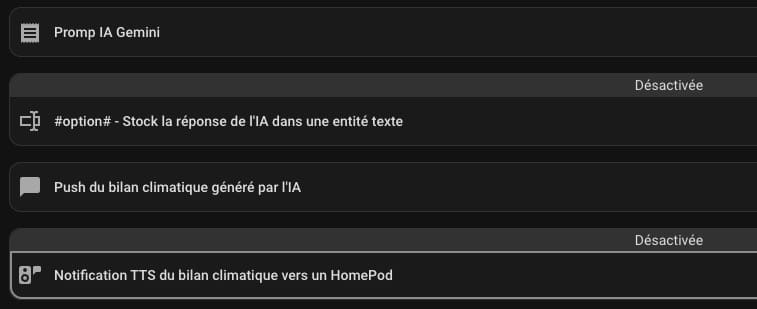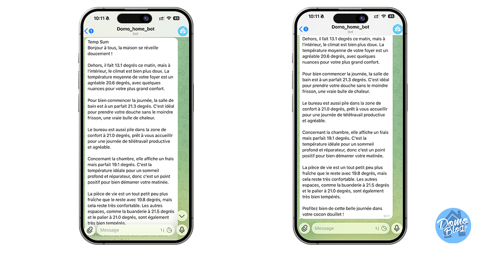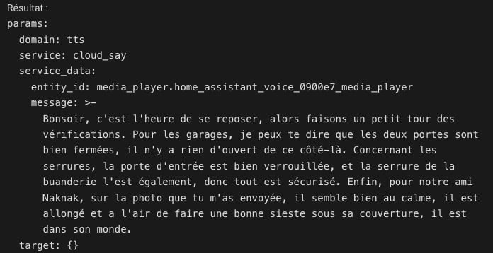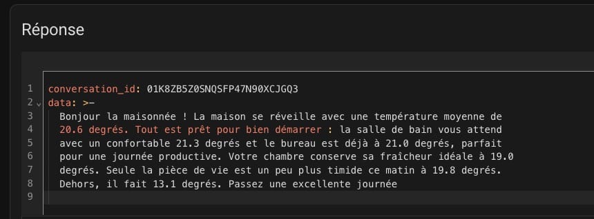 Elle me donne la température extérieure, la température moyenne de la maison, ainsi que des détails pour la salle de bain et le bureau. Avec quelques indications supplémentaires dans le prompt, l’IA ajoute même des touches d’humour et des recommandations, rendant la notification toujours intéressante et agréable. Le prompt est à ajuster en fonction de la destination. Dans mon exemple, la réponse ci-dessus est destinée à la notification vocale pour la diffusion d’un message pas trop long mais avec toutes les informations utiles. Le prompt est également orienté en ce sens pour former un message clair et agréable à écouter.