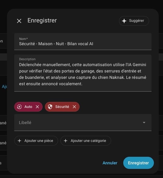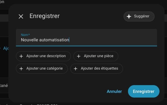 Il existe encore de nombreuses autres utilisations à explorer avec l’IA dans le système domotique. J’ai d’ailleurs une petite liste d’autres idées et utilisations à tester. Cependant, une fonction que j’ai découverte après avoir intégré Gemini à ma domotique est le bouton “Suggestion” qui apparaît dans la boîte d’enregistrement d’une nouvelle automatisation.