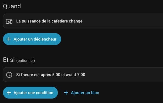 Dans cet exemple, je demande un bilan climatique sur la détection d’une puissance consommée par ma cafetière. C’est le moment parfait (pour moi) pour recevoir mon bilan climatique pendant que mon café coule. J’ajoute également une condition horaire de sorte à n’exécuter ce rapport que le matin et pas sur les autres moments de la journée où l’on se sert un petit café.