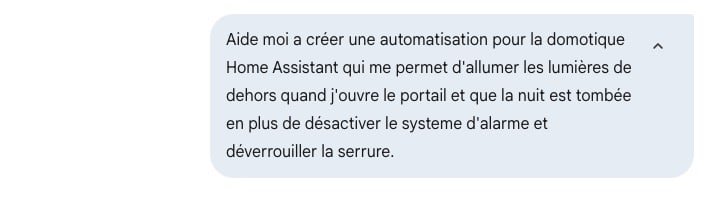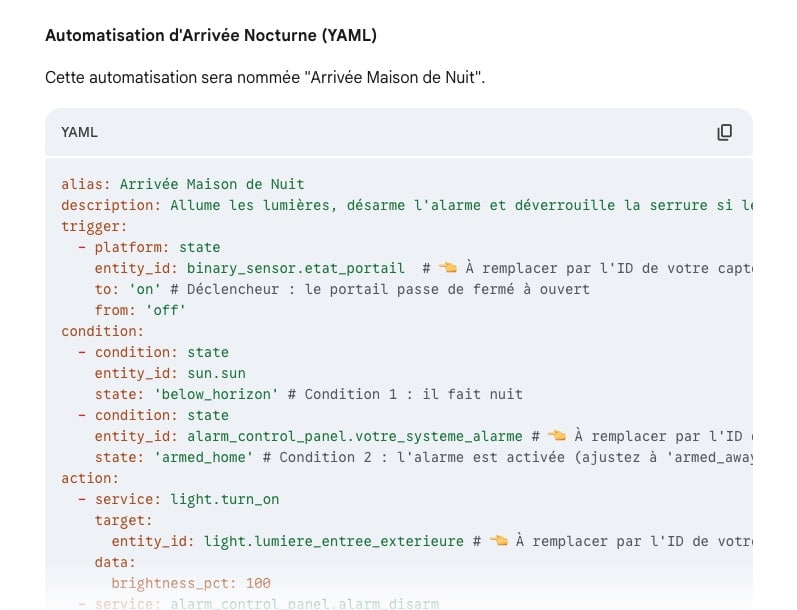 Il est aussi possible de passer les noms des entités en paramètres supplémentaires de votre prompt pour ne même plus avoir à venir modifier le code (ou que très très peu). Petit conseil quand même, l’IA n’est pas infaillible. C’est un excellent outil pour vous accompagner, vous aider à comprendre et entreprendre la construction d’automatisations. Mais il ne faut pas non plus prendre pour argent comptant le résultat. Même si dans la majorité des cas il n’y a vraiment pas grand-chose à ajuster si vous avez correctement rédigé votre prompt, faites toujours une double vérification de ce que vous transposez dans votre domotique.