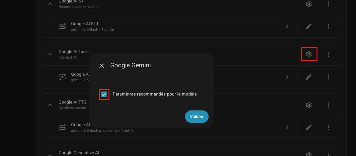 2. Une fois dans les paramètres de l’intégration Gemini, cliquez sur la roue crantée de l’élément Google AI Task, puis désactivez l’option Paramètres recommandés pour le modèle.