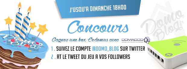 A l’occasion de ses deux ans, domo-blog.fr vous propose de participer à un jeu twitter pour tenter de gagner une box domotique Eedomus + d’une valeur de 299€ offerte par notre partenaire Domadoo