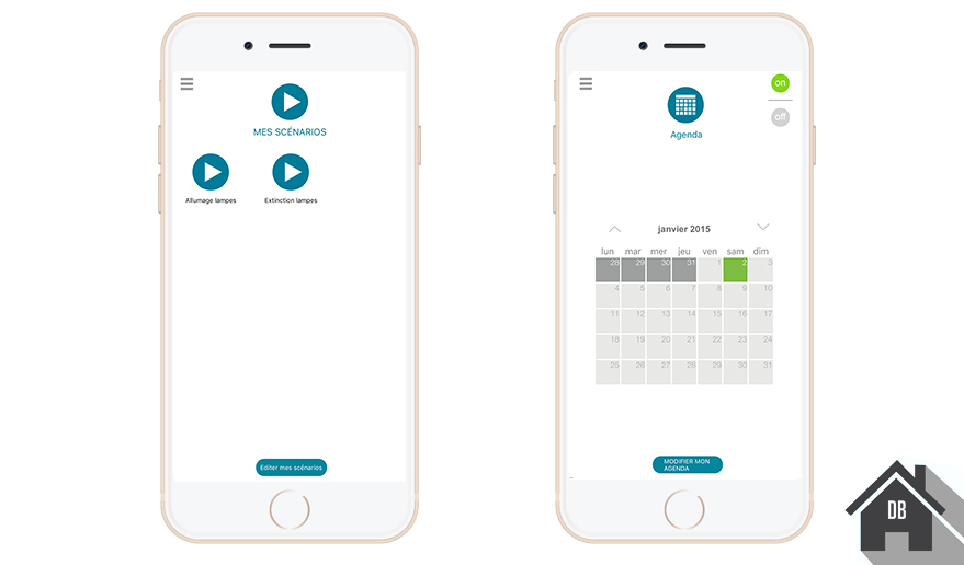 4  A gauche, le menu mes scénarios, pour lancer vos scènes à distance, a droite l’agenda de l’application, très agréable et reussi.