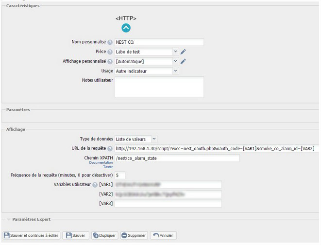 9- Créez un second capteur HTTP “NEST Fumée” et configurez-le comme suit:
