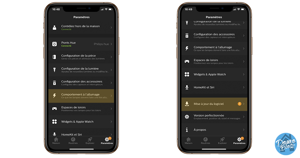 2 Après mise à jour, l’application comporte une nouvelle section “Comportement à l’allumage“. Mais avent de voir cela plus en détail, il faut dans un premier temps procéder à la mise à jour du micro logiciel de vos ampoules Philips hue.