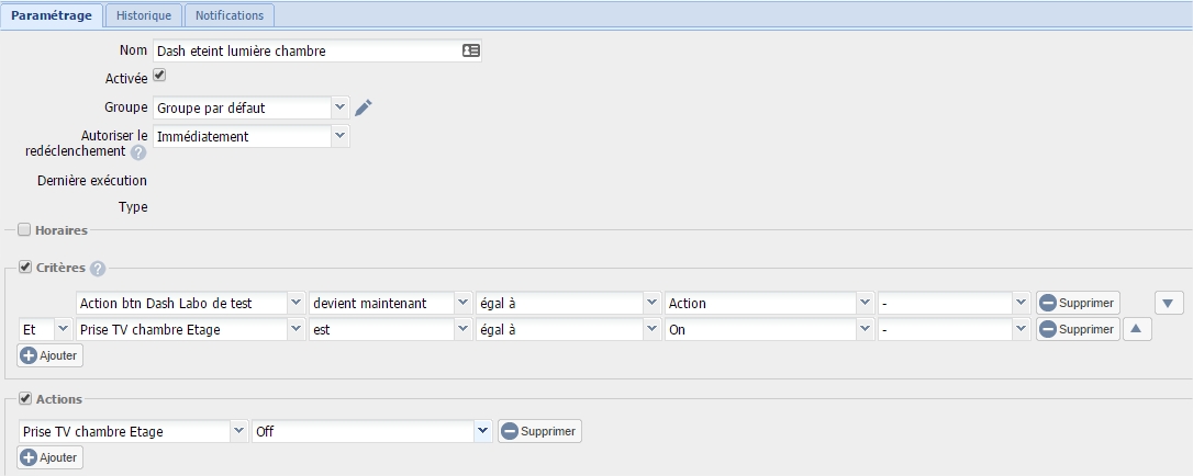 9 Il ne reste plus qu’a mettre en place les règles pour piloter un autre périphérique avec le bouton. Ici une règle pour allumer une prise, la même règle pour éteindre devra être faite pour piloter également l’extinction du même bouton.
