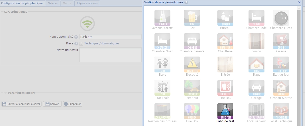 3 Donnez un nom au nouveau périphérique et sélectionnez un pièce d’affectation. Vous constatez au passage la nouvelle fenêtre de sélection de pièce qui n’est plus sous forme de liste mais d’icônes