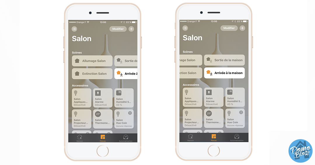 10 Une fois que tous vos périphériques sont correctement configurés dans Homekit, créez quelques scènes. J’ai par exemple 4 scènes de configurées dans Homekit, 2 scènes pour “Allumage/Extinction” des lumières et 2 autres “Arrivée et Sortie” de la maison qui gèrent l’alarme.