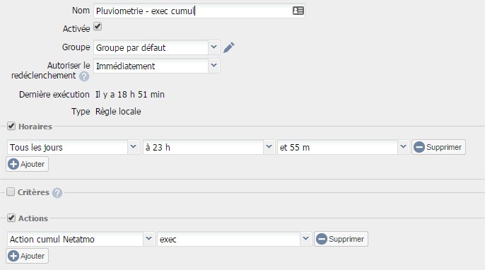 Le script maintenant en place et fonctionnel, il est à présent question d’automatiser son exécution. L’idée est d’exécuter le script tout les jours à 23h55 afin de déverser la pluviométrie du jour dans le cumul du mois en cour.
