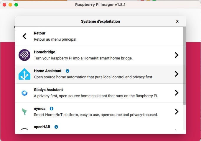 C’est aussi une section Maison connectée dans laquelle on retrouve la possibilité d’installer Home Assistant OS (HAOS) directement depuis Raspberry Pi Imager au milieu d’autres solutions Smart Home compatibles.