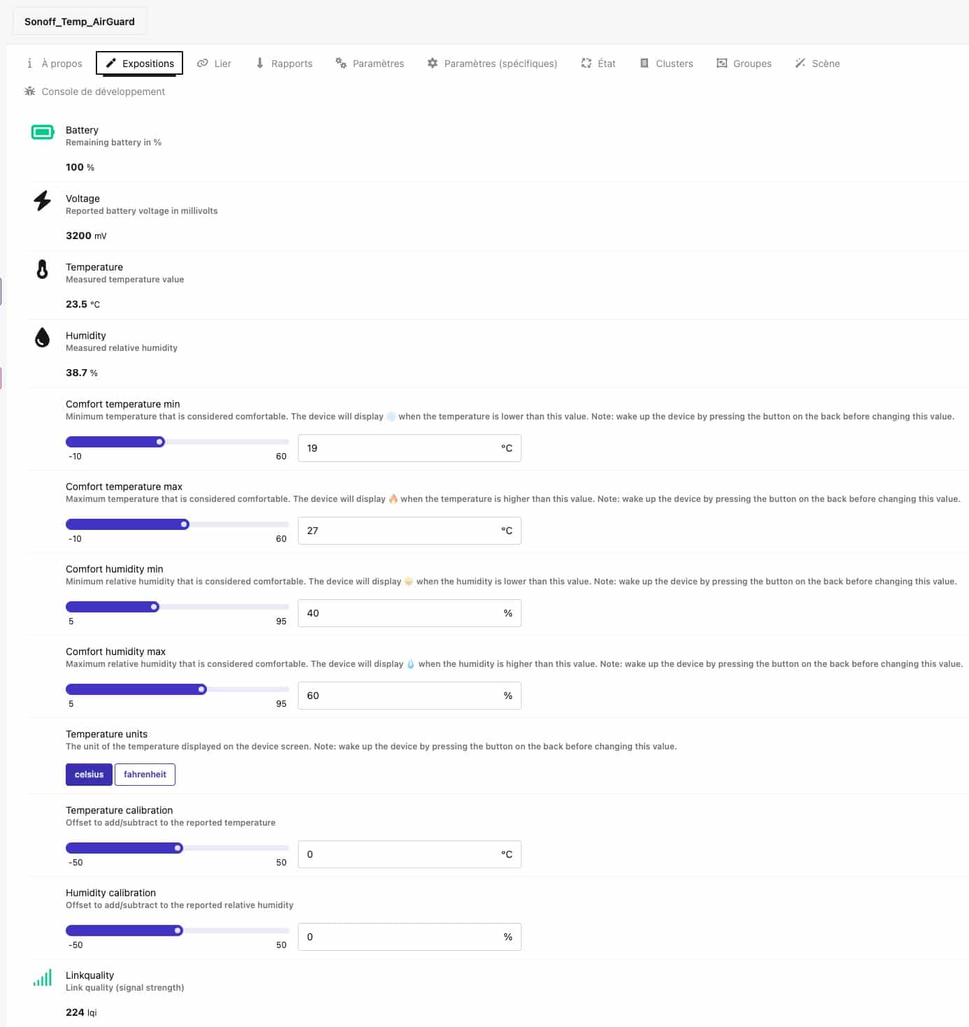 Comme toujours avec les produits Sonoff Zigbee, la prise en charge est immédiate avec Z2M. Cette nouvelle sonde à grand écran LCD ne déroge pas à cette règle, on retrouve l’ensemble des fonctions dans Zigbee2MQTT et par conséquent un support intégré dans ma domotique Home Assistant.