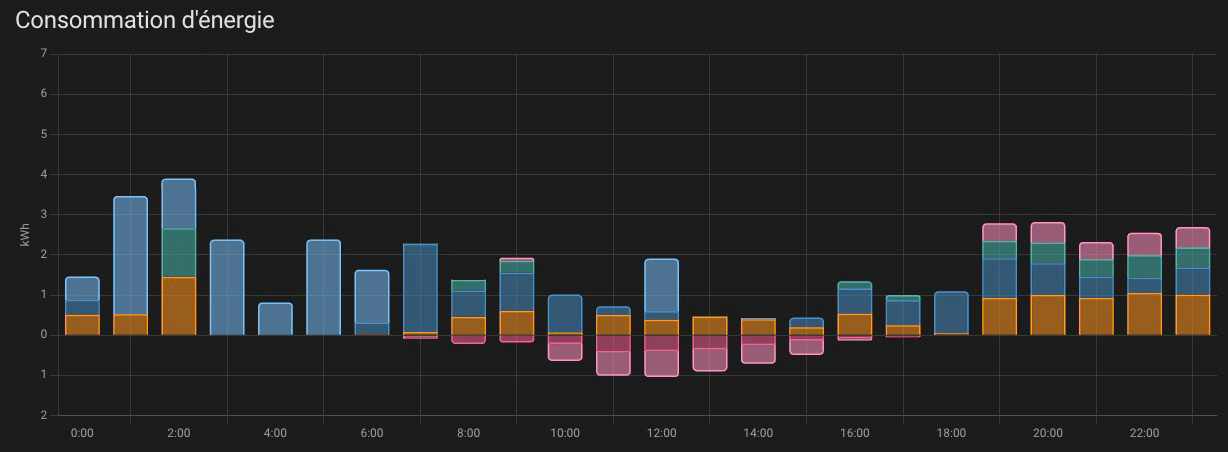 Il ne reste plus alors qu’à suivre la production et le stockage (en rose ici) directement sous la domotique Home Assistant. De quoi se passer complètement de l’application mobile. Ici deux systèmes Anker Solarbank cohabitent avec plusieurs systèmes de production solaire différents. Mais j’enregistre et je visualise tout sous le dashboard énergie de Home Assistant. Je n’utilise alors pas les différentes applications mobile, pratique !