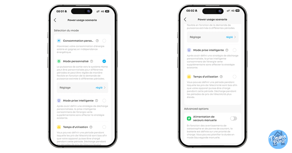 L’application mobile est très bien faite. Je ne vais pas revenir dans le détail car il s’agit exactement de la même application et configuration que nous avons vu avec le test de l’an dernier. Juste un mot sur la configuration qui est simple et rapide. Si vous n’avez pas le smart compteur Anker, vous pouvez effectuer la configuration manuelle. Elle consiste à définir une planification de fonctionnement pour indiquer au système entre quelle plage horaire vous attendrez de lui qu’il stocke l’énergie et quand vous voulez qu’il la libère.