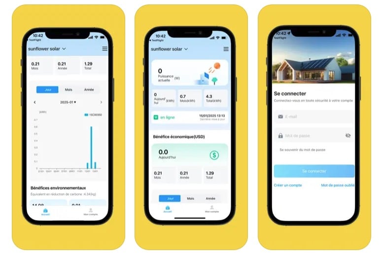 Sunflower dispose d’une application mobile complète qui permet de suivre la production ainsi que les économies réalisées. Si ce n’était