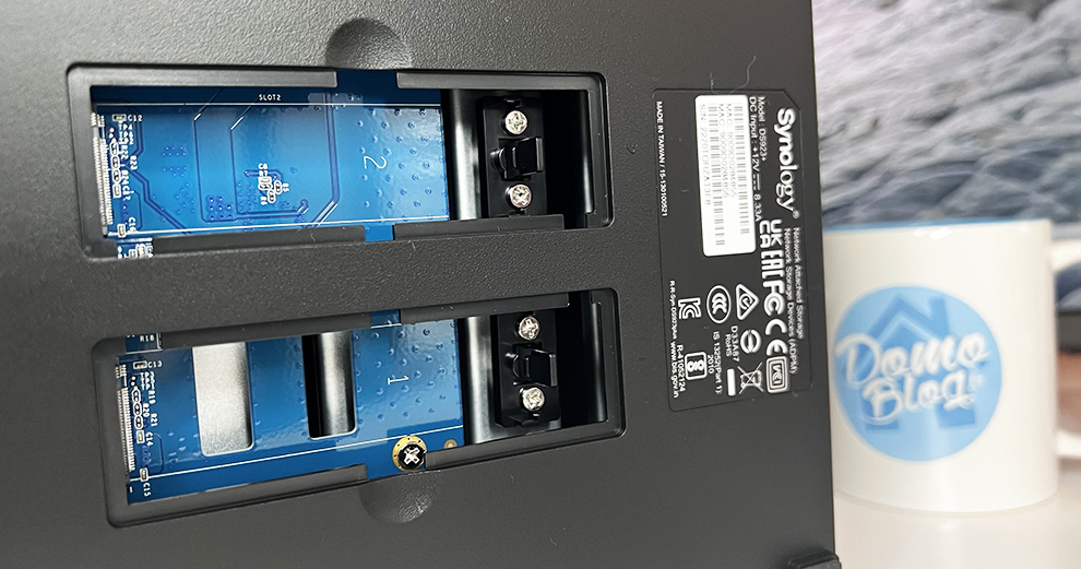 Au-dessus du NAS, on trouve deux trappes pour y monter deux disques SSD M2 destinées à accélerer et améliorer le cache du système. Accessoire mais toutefois utile. Ce n’est pas une obligation au départ, mais avec le temps il est conseillé d’investir dans un disque M2 histoire de booster votre système.