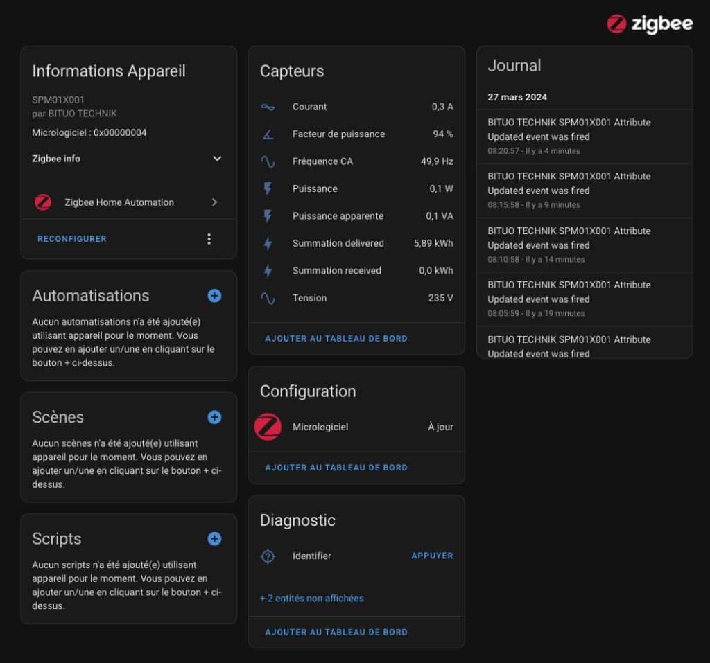Association simple et rapide, l’appareil propose de multiples mesures pour le moins précises. Personnellement j’ai fait le choix d’utiliser ce module sur le circuit de la VMC, un appareil qui consomme peu d’energie, mais le module zigbee Bituo est en capacité à le mesurer très précisément.