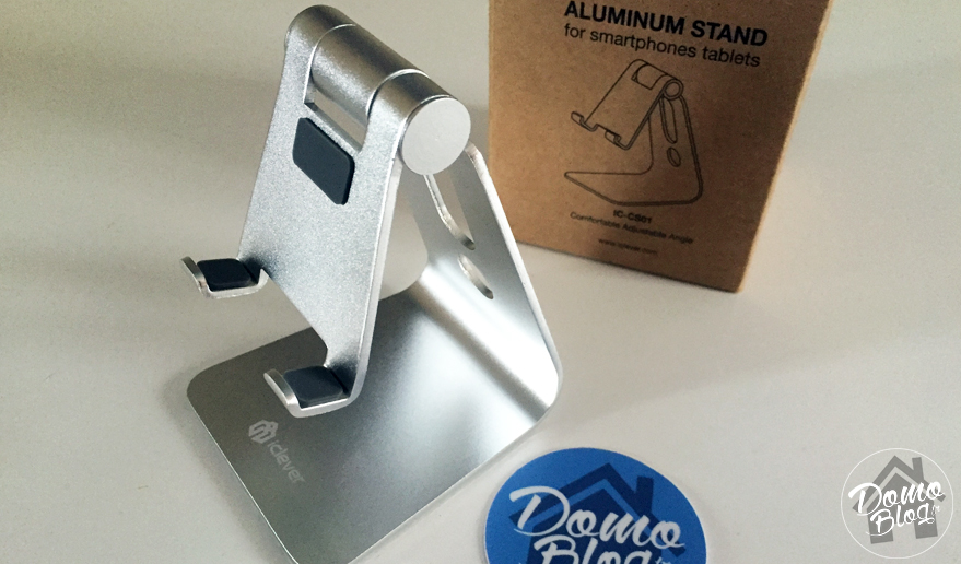 Commençons par le support, il s’agit un support en aluminium, robuste et solide, il peut aisément maintenir un ipad ou une tablette android en toute sécurité. Il dispose de petits patins antidérapant qui permettent une bonne tenue de la tablette qui maintiennent la tablette sur le support et la protège des rayures au passage.