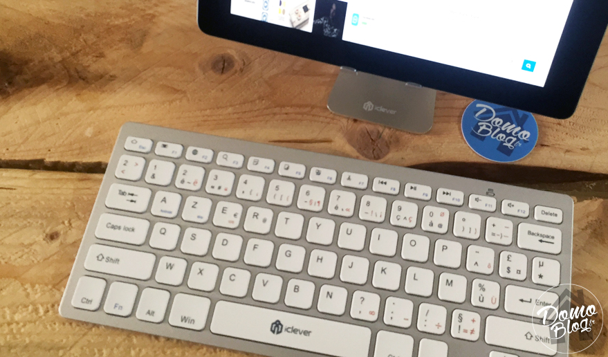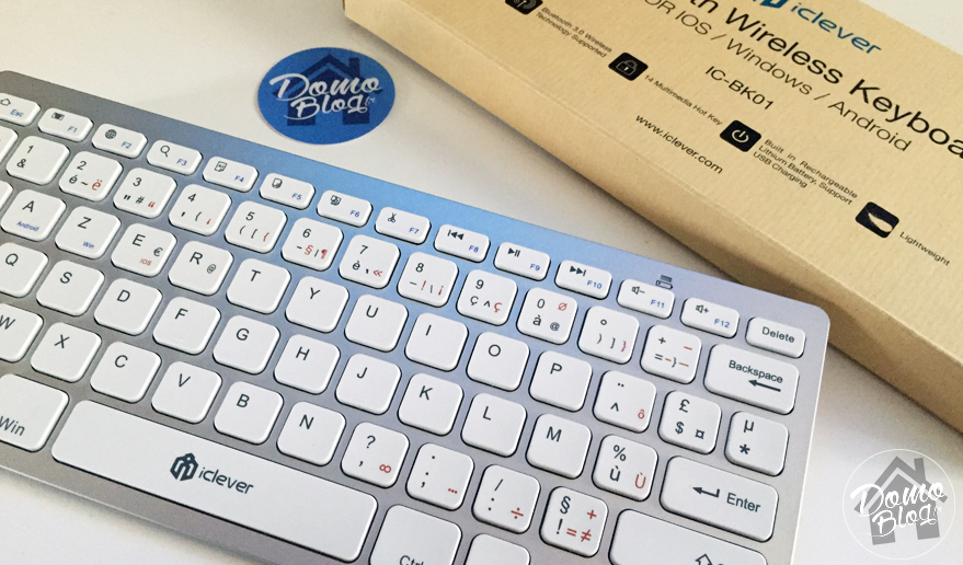 Dans le style des clavier Apple, ce clavier est plutôt jolie et bien fini. La partie grise est en plastique imitation alu et les touches “flat” sont agréables au touché. Pas trop bruyantes, elles disposes de toutes les fonctions et symboles disponible sur un PC. Enfin, le clavier possède 12 touches multimédia pour améliorer un peu plus le confort de navigation. Très utile avec une tablette, il perd selon moi, tout son interet avec un smartphone, mais, sachez cependant qu’un smartphone, qu’il soit ios ou android fonctionnera parfaitement avec.