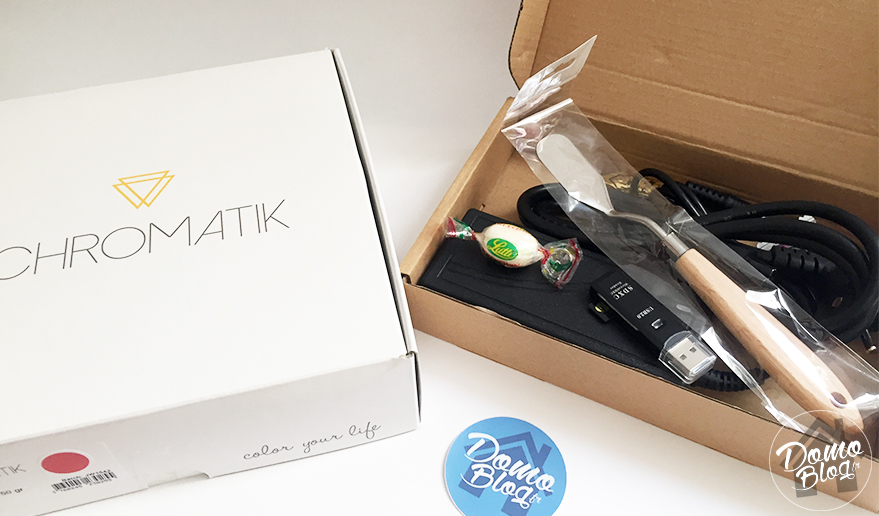 En plus de l’imprimante, sont livrés avec, le nécessaire pour charger des plans dans l’imprimante (carte SD et son lecteur), une petite spatule bien utile pour décoller les impressions et quelques bonbons, toujours utiles également 🙂 Un peu de douceur dans ce monde de brute! Enfin, pour mettre en application ma créativité, Dagoma m’a également livré une bobine de fil Chromatik rouge. Le filament Chromatik est un fil de type PLA, nous verrons plus loin dans l’article ce qu’est exactement le PLA, pour le moment sachez que c’est un plastique respectueux de l’environnement, conçue pour une qualité d’impression optimale.
